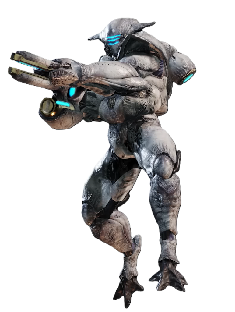 The Overseer is a medium infantry unit of the Illuminate, wielding an energy staff that functions as both a ranged and melee weapon. It also carries a directional energy shield on its left arm, which it deploys for protection when not attacking.
